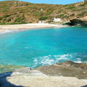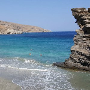 In the south-eastern part of Andros near the small city of Ormos there is Grias To Pidima beach. In Greek the islands name means “the place where the old lady jumped”. There is a path leading to this beautiful sandy beach with the characteristic rock which gave the name to the spot. It is believed that during Turk domination the Castle of Kohilos was given to the enemy by an old lady that asked shelter from its inhabitants but when she entered the castle, she opened the doors deliberately and the Turks dominated it. The old lady was so shameful that she jumped from the cliff and it is believed that she has been turned into stone ever since. Despite this "unpleasant" legend, the beach is a very beautiful cove and pretty popular among visitors and locals.